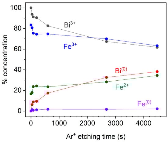The following are available at https://www.mdpi.com/article/10.3390/ma15124285/s1. It displays the XPS spectra and peak parameter evolution with Ar etching time from core levels C , O , Bi , Bi , Fe and the valence band.