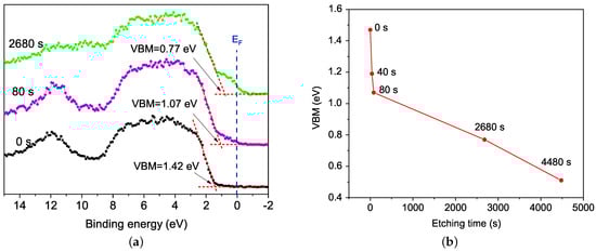 While etching time increases, the band gap decreases with a shifting VBM towards the Fermi level. Valence band tails, as a result of conductive states from metallic iron (Fe) and bismuth (Bi), appear at 40 s and overstep E at 80 s, reaching up to −1 eV value at 2680 s. This behaviour is observed in BFO with and transitions (rhombohedral to orthorhombic and orthorhombic to cubic phase transitions, respectively), where the semiconducting state goes to a conductive one [5]. Figure 9b shows how the VBM value changes with etching time, being more drastic at the first 80 s and changing more slowly at high etching time, still at 4480 s; the VBM is under the Fermi level. The semiconductor bandgap behaviour with argon etching depends on materials characteristics, like stoichiometry in doped materials [50] or nanostructure character [51,52]. In some semiconductor materials, oxygen vacancies reduce directly the band gap through a shifting of VBM value [50,53,54], aspect seen in this work, suggesting that oxygen vacancies could control the BFO’s semiconductor state, an interesting feature for studies of the photovoltaic effect in BFO.