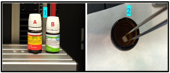 Step 1: The prepared samples were preserved in distilled water, for the first and second tests for Material 1A, Methacrylate Z350 (3M ESPE, St. Paul, MN, USA) and Material 1B Ceram X™ (DENTSPLY SIRONA, Charlotte, NC, USA), shown on the left side of Figure 1. The control Spectrum™ CR (DENTSPLY SIRONA, Charlotte, NC, USA) was kept in a similar colored bottle.