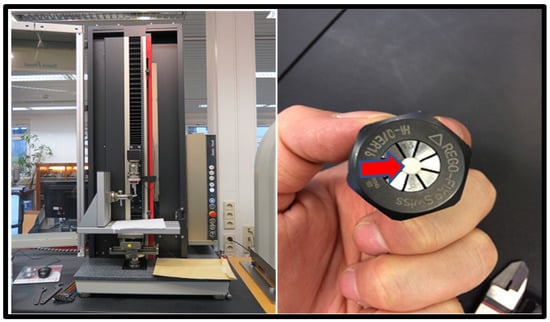 Universal Testing Machine (left), spiral grip device with a sample in the center ((right), indicated by red arrow).