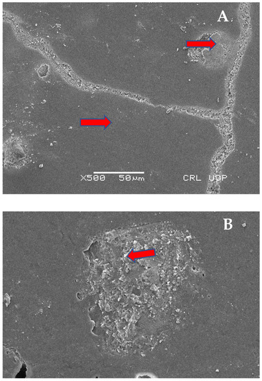 Failure mode of GIC + Spectrum (Group C), adhesive failure under scanning electron microscope. Red arrows indicate adhesive failure regions, (A) at 500×, and (B) at 1000×.