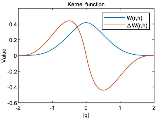 where is the smoothing length which defines the impact domain of the kernel. In this work, the Wendland Quintic kernel function was adopted, as shown in Figure 1: