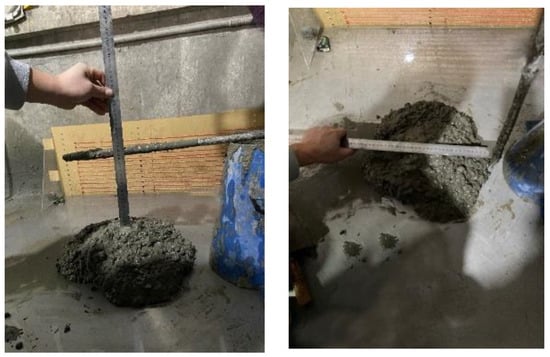 After being certified, the aggregates are mixed into the concrete. Then the mixed material described in Table 1 was slump tested. The slump test is depicted in Figure 5.