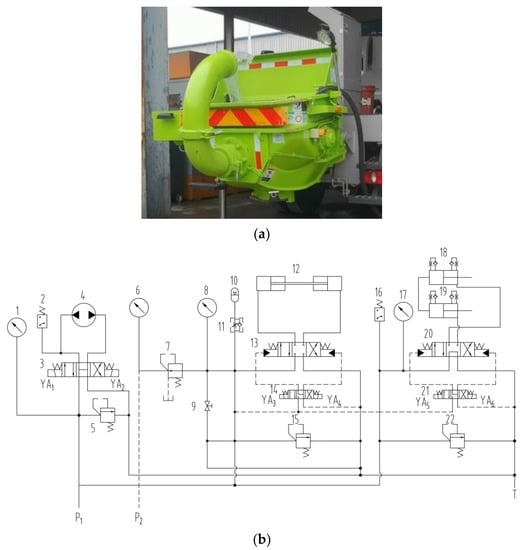 The focus of this work is the response of the concrete suction process relative to an actual physical model during concrete pumping; hence, the pumping mechanism is shown in Figure 8a. The hydraulic schematic of the pumping system is depicted in Figure 8b. In this Figure, 1, 6, 8, and 17 are the pressure gauge; 2 and 16 is the electromagnetic control reversing device; 3, 13, 14, 20, and 21 are the hydraulic directional valve; and 5, 15, 22, and 7 are the pressure control valve. Actuator hydraulic motor 4 is the mixer paddle. Hydraulic cylinder 12 is the distribution valve swing cylinder. Hydraulic cylinders 18 and 19 are pumping cylinders. The pumping process by hydraulic cylinders 18 and 19 alternates direction with the oscillating hydraulic cylinder 12 to complete the pumping process.