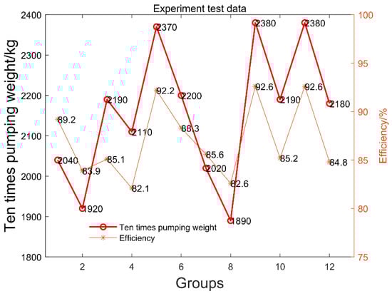 The hydraulic pump output flow rate can be determined, and the average efficiency in many pumping trials can be calculated using the ratio of the two flow rates. The experimental process should be performed ten times, with each group employing concrete pumps. The findings on efficiency and mass are displayed in Figure 10.