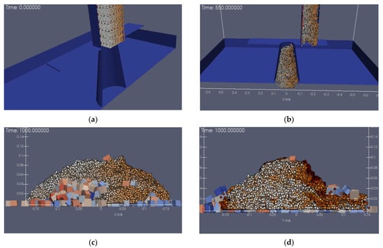 In Figure 11a, the concrete slump vacant part is the location of aggregate generation for the DEM method, while the aggregates are SPH particles. The initial fresh concrete was mixed and stirred above the slump cylinder and entered the cylinder by gravity. Aggregates were generated in the proportions given in Table 1. Figure 11b shows the fresh concrete flowing into the slump cylinder; the yellow part indicates the concrete slurry while the rest is the concrete aggregates. Once the concrete has entered the slump cylinder, the vessel is quickly lifted, at which point the slump experimental process begins. The slump experimental results are shown in Figure 11c,d. Figure 11c is the cross-section in the X–X direction; at this time, the slump corresponding to the simulation analysis was about 190 mm, the remaining height was 110 mm, and the extension was 375 mm. In Figure 11d, the slump is shown as 400 mm. The simulation analysis results were compared with the experimental results, and the data results are shown in Figure 12.