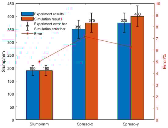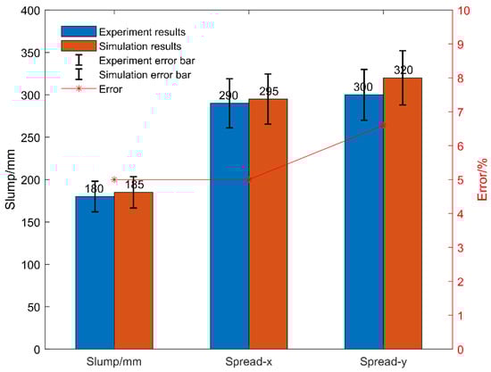 The simulation analysis results of Group 2 were compared with the experimental data, as shown in Figure 14. The slump was 180 mm in the experiment and 185 mm in the simulation, and the expansions were 295 mm/290 mm and 320 mm/300 mm, respectively. The error between them was small, which suggests that the SPH-DEM method showed a good response and fitting to the actual physical model.