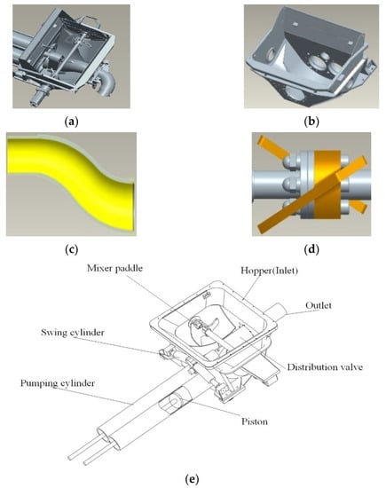 Therefore, the mass of concrete pushed via the pumping cylinder is approximated by that sucked by the pumping cylinder, i.e., the conservation of mass. It is critical to investigate the efficiency and mass sucked by the pumping cylinder. Figure 15 depicts the pumping simulation analysis model applied in this research; the trailer pump assembly (a), the hopper (b), the distribution valve (c), and the mixer paddle (d) are shown. The reciprocating motion of the pumping cylinder and the distribution valve play a supporting role to the pump to concrete.