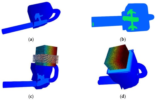 The experimental process is complex. As such, simulation analyses were used to find a way to optimize the experimental prototype, which can be understood as approximating and matching the changing trend of the simulation analysis system and the actual experimental model. The actual experiment model contains too much information in the edges and corners, increasing the difficulty for the simulation analysis model to focus on real issues. Therefore, the edges and corners must be simplified. The redundant hole features in the pumping structure model shown in Figure 16a–d depict a basic simulation analysis model.