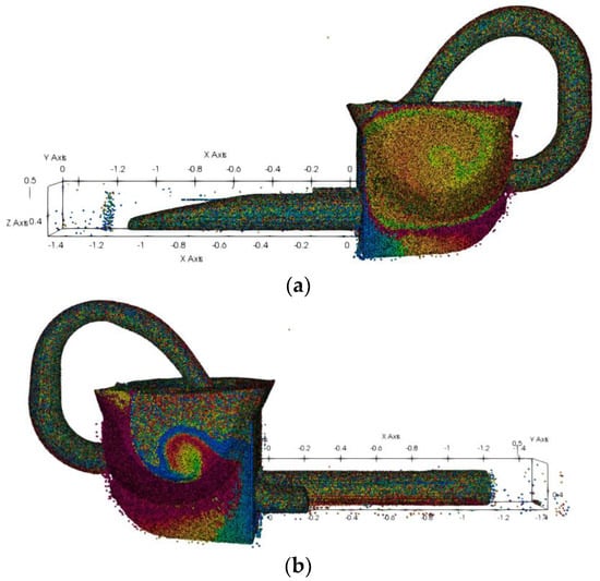 The simulation results of Group 2 are shown in Figure 13a,b. The slump of the compared process was 180 mm, while that in the simulations was about 185 mm, and the extension were set to 300 mm and 325 mm, respectively.