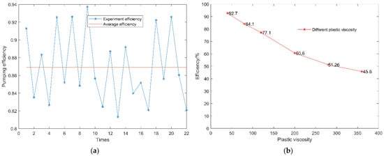 Experimental concrete pumping efficiency. (a) Simulation average efficiency. (b) Efficiency trends at different plastic viscosities.
