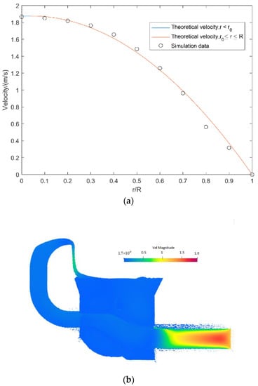 Simulated and analytical velocities of concrete pumping process. (a) Analytical laminar velocities. (b) Velocity cloud map.