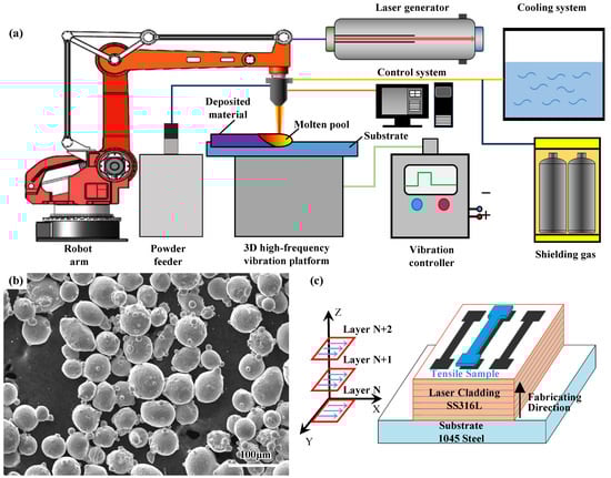 SS316L powders were adopted for the cladding layer due to its moderate price, strong corrosion resistance and great self-melting property. The SS316L spherical powders (Zhejiang Asia General Soldering & Brazing Material Co., Ltd., Zhejiang, China) with a particle size range between 48 and 75 µm were used in this study. Before experiments, the powders were baked in an oven at 120 °C for 30 min. The powder morphology is shown in Figure 1b. For the substrates, 1045 steel plates (Shanghai Shanxiong Special Steel Co., Ltd., Shanghai, China) with dimensions of 100 mm × 10 mm × 20 mm were used. Prior to the cladding process, the substrates were polished by abrasive paper to remove the oxide layer and then cleaned by alcohol. The chemical compositions of the 1045 steel plates and the SS316L powders are shown in Table 1, which were from the data sheets provided by the suppliers.