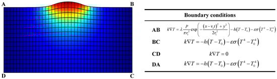 where λ is the absorptivity of laser, P is the power of laser, and rl is the radius of the spot vs. the scanning speed. The boundary conditions are shown in Figure 2.