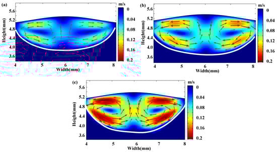 The flow field distribution of different vibration modes in the laser cladding melt pool at t = 0.45 s: (a) without vibration; (b) with 1D vibration; (c) with 2D vibration.