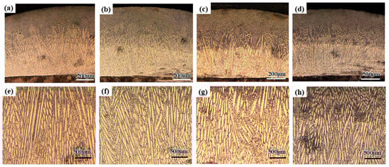 Cross-sectional morphology of laser cladding with or without vibration: (a) without vibration; (b) with 1D vibration; (c) with 2D vibration; (d) with 3D vibration; (e) without vibration in high magnifications; (f) with 1D vibration in high magnifications; (g) with 2D vibration in high magnifications; (h) with 3D vibration in high magnifications.