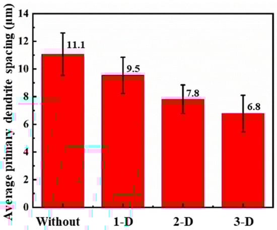 It can be obtained from Equation (11) that primary dendritic spacing is inversely proportional to the cooling rate. Therefore, the larger cooling rate caused by vibration will lead to smaller primary dendritic spacing. With 1D high-frequency vibration, the cooling rate is affected by a single-dimensional oscillation applying to the molten pool. When multidimensional high-frequency vibration is applied, the melt flow can be accelerated and the heat transfers from the molten pool to the liquid–gas interface quickly. Significant stir occurs in 3D high-frequency vibration, leading to further accelerated cooling, dendrite fragmentation and irregular heat dissipation direction [19]. The above deduction is consistent with the experimental results in Figure 6 and the simulation results in Figure 3 and Figure 4.