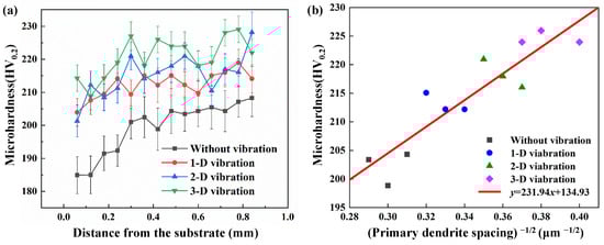 Vickers hardness was tested to investigate the effect of vibration on the mechanical properties of the cladding, and the results are shown in Figure 7a. The microhardness varied from 184 to 208 HV0.2 from the top to the bottom of the cladding without vibration, and the average microhardness was 199 HV0.2. When multidimensional high-frequency vibration was applied, the microhardness of the cladding layer was significantly improved. The average microhardness of the cladding layer was 212 HV0.2, 215 HV0.2, 221 HV0.2 for 1D, 2D, and 3D vibration, increasing by 6%, 8%, and 11%, respectively. It was commonly accepted that the microhardness increases significantly due to the refined microstructures [29,30]. Meanwhile, the microhardness fluctuation along the build direction was relatively minor with the assistance of vibration. In addition, the solid-solution strengthening can be promoted by the external vibration energy [15]. Therefore, the uniformity of the hardness increased with the applying of vibration. To further analyze the relationship between the microhardness and primary dendrite spacing, a Hall–Petch kind of relationship was well fitted, as shown in Figure 7b. It indicates that the decrease in the primary dendrite spacing caused by vibration is able to enhance the microhardness.