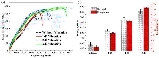 The tensile properties assisted by vibration are shown in Figure 8. It can be observed that the plasticity of samples with vibration was significantly enhanced. The stress–strain curves of the cladding layers are shown in Figure 8a. It can be found that the tensile strength was significantly improved by vibration. Furthermore, comparison of the tensile properties including tensile strength and elongations was carried out, and the results are shown in Figure 8b. The average tensile strength of the samples without vibration was 456.9 MPa, and the samples with 1D vibration, 2D vibration, and 3D vibration were 510.8 MPa, 548.8 MPa, and 580.9 MPa, increasing by 11.8%, 20.1%, and 27.2%, respectively. In addition, large elongations of samples were observed in the condition with vibration. The average elongations of the samples without vibration was only 6.80%, while the ones with 1D vibration, 2D vibration, and 3D vibration were 9.41%, 11.80% and 14.30%, increasing by 38.6%, 73.9%, and 110.8%, respectively.