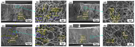 Fracture morphologies of the 316L samples after tensile tests: (a) without vibration in low magnifications; (b) without vibration in high magnifications; (c) with 1D vibration in low magnifications; (d) with 1D vibration in high magnifications; (e) with 2D vibration in low magnifications; (f) with 2D vibration in high magnifications; (g) with 3D vibration in low magnifications; (h) with 3D vibration in high magnifications.