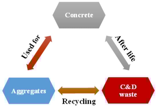 Due to the building industry’s increasing demand, the production and application of ecologically friendly concrete manufactured from waste materials have increased quickly over the past few decades [1,2,3]. Concrete production currently averages around 1 t per person per year [4]. However, the considerable amount of concrete produced meets building industry requirements and has a detrimental influence on environmental circumstances [5,6,7,8]. The manufacturing of concrete and aggregates results in the generation of carbon dioxide (CO2), dust, and other hazardous gases, which cause environmental damage [9,10,11,12,13,14]. Recently, the application of RA in concrete has acquired prominence in research, since it produces environmentally friendly concrete that also performs well in terms of mechanical properties [15,16,17,18]. Globally, the need for this type of concrete is increasing as a result of uncontrollable circumstances, such as earthquakes, resulting in major environmental challenges [19,20,21,22,23,24]. RA-based concrete is one of the potential options for lowering the rate of natural resource consumption [19,25,26,27]. RA takes various forms, such as tiles, different types of concrete marbles, asphalt, and brick aggregates. RA concrete refers to aggregates that are commonly refined by the parent or recycled crushing of concrete, such as waste-crushed concrete [28]. An illustrative diagram of the recycling operation is depicted in Figure 1. The concept of recycling RA from concrete containing waste materials has been used in Europe since World War II. Currently, RA concrete is employed as a sub-base material for unbound pavements. It is also employed in structural concrete [29,30]. Moreover, the concrete’s fine fraction from construction and demolishing (C&D) waste can be utilized as a partial replacement of cement [31]. This results in the reduction in cement demand, and the problems raised from the production and use of cement are controlled. The positive effects of recycling C&D waste for use in construction materials are self-evident, as it results in environmentally beneficial construction. While the application of this type of waste in concrete is limited because of its limited strength, low Young’s modulus, and higher deformation, the desired strength can be attained by applying an appropriate mix design [32].