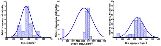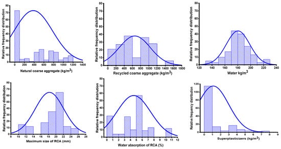 The models’ performance was determined by their variables and the database required to run them. The data utilized to run the models for predicting the STS of concrete in this study were obtained from prior research [39,40,41,42,43,44,45,46,47,48,49,50,51,52,53,54,55,56,57]. The data were arranged in such a way that the model could realize both input and output parameters. A number of parameters were kept in the category of input, such as water (WA), cement (CE), fine aggregate (FA), natural coarse aggregate (NACA), recycled coarse aggregate (RECA), superplasticizers (SPS), the maximum size of RA (SRA), the density of RA (DRA), and water absorption of RA (WARA), with one output parameter (STS) used to run the models. However, the Python coding was configured in such a way that it automatically split the data into 60% for training, 20% for testing, and 20% for validation of the model. Figure 2 is the reflection of the variables’ frequency dispersal. Table 1 displays the expressive statistical analysis of the parameters, as well as the numerous mathematical descriptions that are included. Additionally, the complete adopted methodology of this study is offered in the graphical representation, as can be seen in Figure 3, which offers information on the study’s sequential methodology.