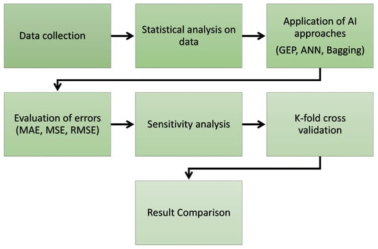The application of the RA in concrete can considerably enhance the characteristics of the material if additional suitable components are used. Recent years have seen a surge in the popularity of new approaches to AI for predicting the required outcomes in the area of material testing [33]. For the investigation of the strength (compressive or tensile) of concrete, since it typically takes a number of days to reach the necessary strength, without wasting time or money, AI approaches may be employed to anticipate the strength properties of concrete. Typically, AI algorithms, such as neuro-fuzzy, decision trees (DT), neural networks, bagging regressors, boosting regressors, AdaBoost, support vector machines (SVM), and gradient boosting are employed to anticipate the strength of concrete. De-Cheng et al. [34] anticipated the CS of concrete using an adaptive boosting technique using 1030 data points, achieving a 98 percent accuracy rate compared to the real results. Dong et al. [35] forecasted the performance of concrete using an ANN model and Monte Carlo simulation. Muhammad et al. [36]’s research was based on the anticipation of concrete strength with bagasse ash; the projected accuracy was over 80%, showing superior performance. Aliakbar et al. [37] used GEP to develop a novel formulation for the properties of RA concrete. They used data from the literature to find the CS, flexural strength, STS, and elastic modulus. Taihao et al. [38]’s study described the application of various ML techniques for the estimation of the Young’s modulus of concrete containing RA. Random forest (RF) and SVM were used to predict the outcome, which demonstrates the accuracy of the prediction.