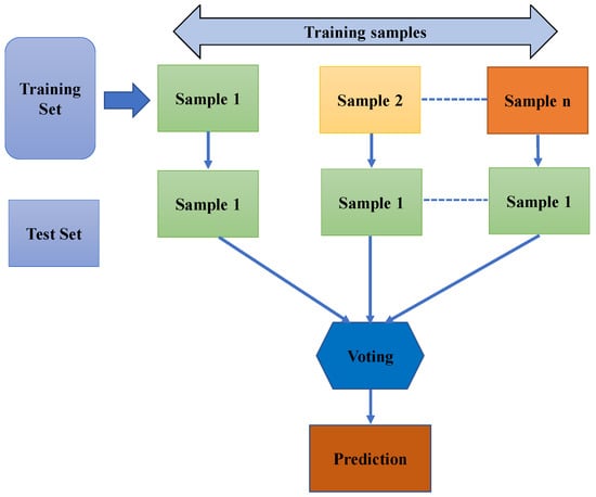 The RF approach is immensely useful as a general-purpose classification and retrogration tool. The strategy is used to handle two distinct groups of problems: developing a prediction rule in a supervised learning problem and evaluating and ranking variables based on their predictive power. Moreover, it is flexible for larger-scale issues and adaptable to a range of ad hoc learning tasks, and it returns calculations of different levels of significance. The strategy, which aggregates the predictions of numerous randomized decision trees, outperforms other techniques when the number of variables exceeds the number of observations. There is a wide variety of RF strategies, which are defined by (1) the method employed to build each individual tree, (2) the process adopted to generate the altered data sets employed to assemble each individual tree, and (3) the process incorporated to aggregate the projections of each individual tree to create a unique consensus forecast. Additionally, it is adaptive to challenges on a big scale, capable of performing a variety of ad hoc learning tasks, and delivers measures of varying relevance. The execution method of the RF approach is shown in Figure 4.