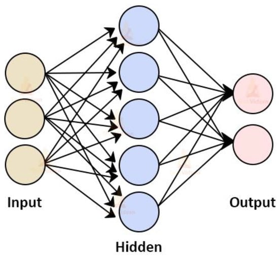 NN alludes to ensuring the type of system that is stimulated by the neural networks in biology that strengthen the brain. ANN is built on a platform of connected units or nodes, referred to as artificial neurons. Neurons’ function and structure are exact replicas of the brain. Prior to processing, these neurons receive a signal and can communicate with the neuron to which they are attached. The initial value denotes a “signal” at a joint, while each neuron’s outputs are expressed by a variety of non-linear parameters of the total sum of its inputs. As with neurons, edges often have a weight that changes as the learner develops. The weight is modified in accordance with the link’s signal strength. Suppose a neuron receives an aggregate message because of the possibility of the entry point, such as a previous frequency response. Neurons are typically structured in the form of layers. Every layer’s outputs serve a distinct purpose. These stages facilitate the transfer of signals from the first (input layer) to the last (output layer). The artificial neural network is a scalable system that employs a wholly distinct methodology from conventional AI and instruction processing technologies. It helps to reduce the limitations of previous logic-based AI in dealing with intuition and large datasets and offers the benefits of adaptive, self-organizing, and real-time learning. Figure 5 illustrates the architecture of an NN.