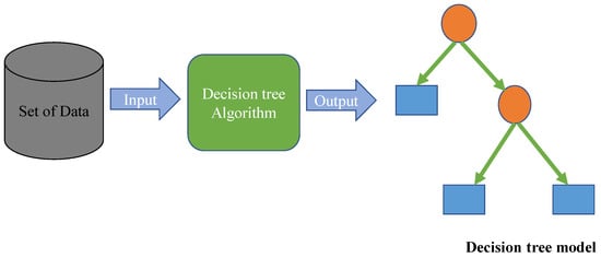 In comparison to other categorization approaches, decision trees can be generated very quickly. These trees may simply be translated to SQL queries that can be used to access databases effectively. When compared to other classification approaches, decision-tree classifiers achieve comparable, if not superior, accuracy. The decision-tree algorithm can be applied serially or in parallel, depending on the volume of data, the amount of memory available on the computer resource, and the algorithm’s adaptability. DT classifiers have not been as widely adopted as analytical or neural/connectionist approaches in the remote sensing sector. Among the obvious benefits of decision trees are their capacity to maintain data measured on a variety of scales, their lack of suppositions about the summary statistics of the data in each class, and their resilience, specifically, and capacity to deal with non-linear interactions between characteristics and classes. The primary advantage is their capacity to select the most skewed aspect and improve its comprehensibility. Additionally, they are easily classifiable and interpretable. Furthermore, they are applicable to both continuous and discrete data sets. Figure 6 depicts a schematic illustration of the DT model in more detail.
