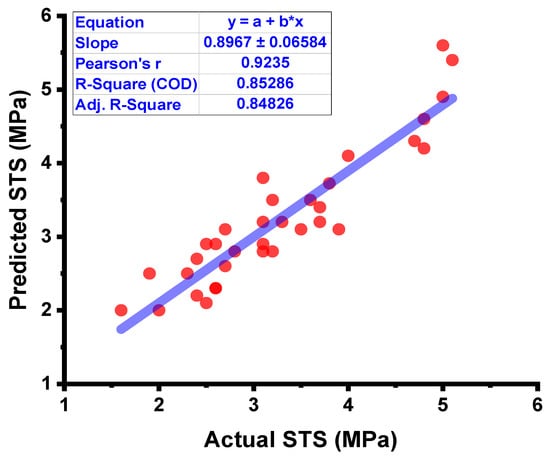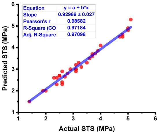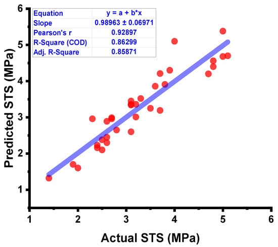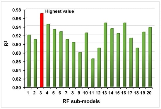 RF is utilized in supervised learning to eliminate both bias and variance. The theory is based on the notion that individuals develop sequentially. Except for the initial learner, all succeeding learners are developed from prior learners. In a sense, learners become powerful. For its part, replacement sampling, RF is an approach used to randomly select data from a set, with the added feature that the same data point might be taken more than once. Using a variety of data samples, these weak models were trained separately and based on the task at hand (regression or classification, for example); the average or majority of the projections result in a more accurate assessment. This was performed in order to establish which algorithm performed better in terms of forecasting performance than all others. The RF model’s output was more valuable, with an R2 value of 0.97 compared to 0.85 for the DT model and 0.86 for the ANN model, indicating a higher level of precision. In comparison, Yuan et al. [58] also predicted the compressive and flexural strength of recycled aggregate concrete. Their results were also within the acceptable range and confirmed that these techniques can be successfully employed to investigate the mechanical properties of concrete. In addition, we analyzed the performance of the DT, ANN, and RF models by a statistical approach and the CV method, which we found to be effective. When the error levels are low, the model’s performance is satisfactory. However, evaluating and recommending the optimal machine-learning regression model for calculating probability over a broad range of topics is challenging due to the fact that the model’s performance is highly dependent on its input parameters and data points. Fortunately, there is a solution. Ensemble machine-learning methods, on the other hand, frequently take advantage of weak learners by creating sub-models that can be trained on data and optimized for the maximum R2 value. Figure 16 depicts the distribution of the R2 values for RF sub-models based on their frequency. Furthermore, according to the research, RF models surpass other machine-learning techniques in terms of accuracy and precision. In addition, we performed a sensitivity analysis to examine the impact of each input parameter on the expected STS (see Additional Resources). The input parameter values, and the number of data points used in the model can both have an impact on the model’s performance and accuracy.