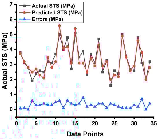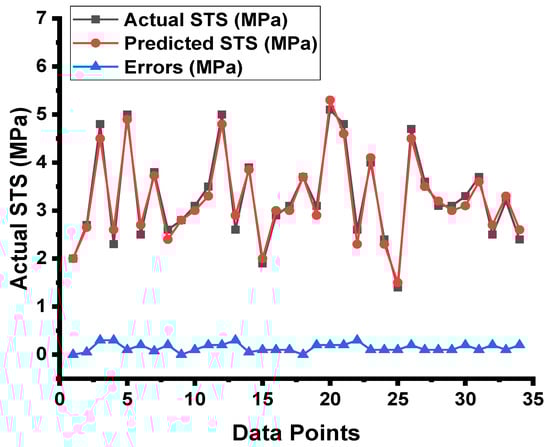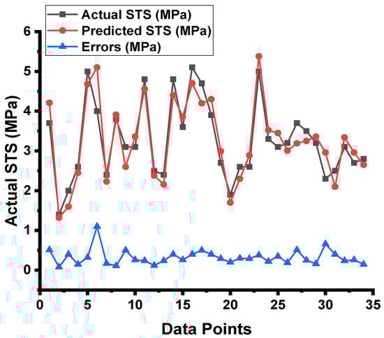 Figure 7 illustrates the numerical calculation of the actual and potential data for the STS of the concrete material by employing the ANN model. The NN technique shows reasonably accurate outcomes, with less variation among the results collected from the laboratory work and the projected outputs from the model. With an R2 score of 0.86, the selected model precision is reasonably acceptable in predicting the required result. Figure 8 shows the scattering of the results obtained from the experimental approach (targeted), predictions, and error results for the ANN model. For the data set, the high, low, and average output were noted as 1.10, 0.080, and 0.320 MPa, respectively. Although 2.94% of these scores were between 0.10 and 0.30 MPa, 52.95% of the erroneous values fell between 0.10 and 0.30 MPa, and 40.11% outpaced 0.31 MPa.