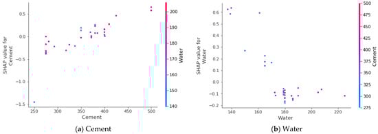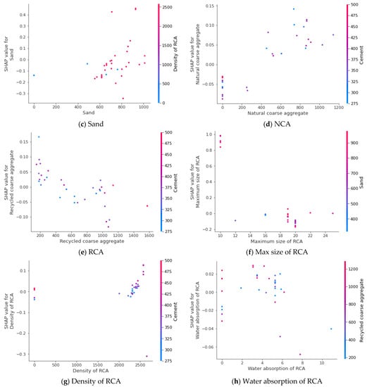 Figure 13 depicts the feature interactions for the STS of the RCA concrete. Figure 13a illustrates the cement feature interaction. As shown in Figure 13a, the cement interacted positively with the STS of the concrete. The plot shows that increasing the cement content resulted in a higher STS of the RCA concrete. Figure 13b depicts the negative interaction of the water with the STS of the concrete. It is a clear fact that an increase in water results in a decrease in concrete’s strength. Similarly, Figure 13c shows the interaction of the sand with the STS of the selected concrete. It was noted from the distribution that the increase in the amount of sand showed a positive direct relation to the concrete’s strength in the range of 600 kg/m3 to 100 kg/m3. Figure 13d indicates the interaction of the natural coarse aggregate with the STS of the concrete, showing the linear trend toward and positive direct relation with the strength of the concrete. However, Figure 13e,f shows the interaction of the recycled coarse aggregate and the maximum size of the recycled coarse aggregate with the strength of concrete. Both of the plots demonstrate the negative impact on the output. This was because of the high porosity of the recycled aggregate, which affected the strength of concrete. Moreover, as the density of the RCA increased, it showed a direct positive relation to the STS of the concrete, as can be seen in Figure 13g. This was due to the fact that, as the density increased, the material became less porous, which reduced the absorption of the water, leading to higher strength. However, Figure 13h also shows both the positive and the negative interactions. On the plot, water absorption of up to 4% indicates the increment towards the STS of the concrete, while beyond 4%, a decrease in the trend towards the STS of the concrete can be seen. This was because if the recycled aggregate absorbed more water from the mix, the amount of water required for cement hydration decreased, which affected the strength of the concrete material.