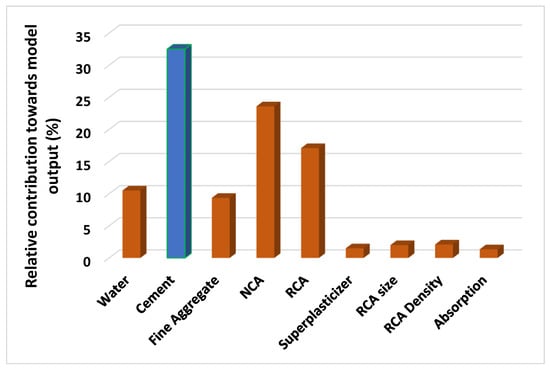 In this strategy, Figure 14 shows how different factors affect the prediction of the STS of RA concrete. According to the report, the cement was the highest contributor to the predictions, with 32.5 percent, followed by NCA, with 23.6 percent, and RA, with 17.1 percent. The prediction of the STS of the RA-based concrete was least affected by the fine aggregate, water, superplasticizers, coarse aggregate size, RCA density, and RCA water absorption.