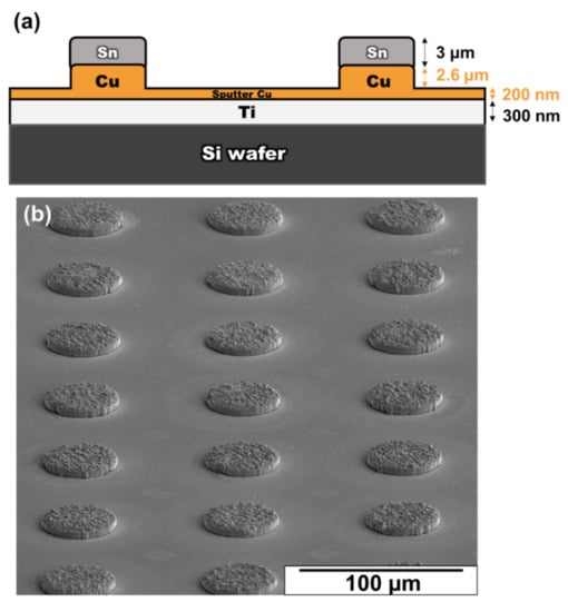 (a) Schematic drawing of the configuration of the Sn/Cu/Ti structure in this study; (b) Micrograph showing the top view of micro-bumps.