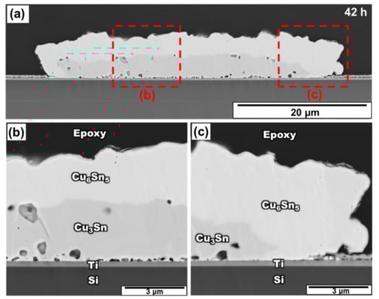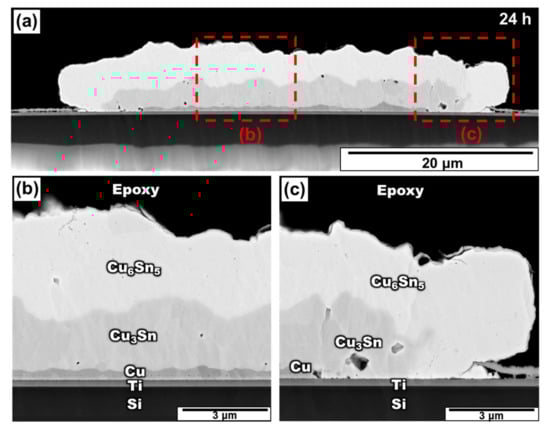 Figure 3 shows the micro-structure of the Sn/Cu micro-bumps aged at 200 °C for 24 h. At this stage, Sn is completely converted into Cu6Sn5 and Cu3Sn. As shown in Figure 3b, since the Cu layer was still in contact with the IMC and Ti layer, it demonstrated good adhesion properties in the middle of the bump. Furthermore, because of the surface diffusion [,,], the bump edge developed IMCs more rapidly than the middle. In addition, the Cu layer was completely consumed at the edge of the bump. Therefore, the IMCs touched the Ti adhesion layer effortlessly at the bump edge. As shown in Figure 3c, even when all the Cu layers were fully depleted, the right edge of the bump exhibited good adhesion between the IMCs and the Ti layer, without any obvious cracks. Similarly, the left edge of the bump shows the same phenomenon. This result indicates that no spalling effect occurred between the IMCs and the Ti layer, implying that the IMCs adhered to the Ti layer more stably on mutual contact.