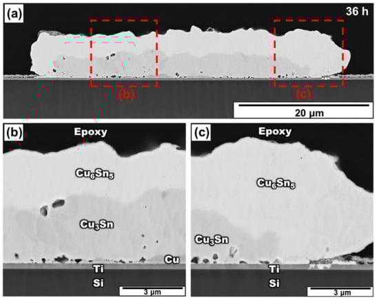 Figure 4 shows the micro-structure of the Sn/Cu bump aged for 36 h. The Cu3Sn layer enlarged because of the reaction between Cu and Cu6Sn5. At this stage, as most of the Cu converted into Cu3Sn, the Cu layer became discontinuous and formed a series of isolated regions. Compared to the result of aging for 24 h, the interface of Cu3Sn/Cu/Ti exhibited more voids in the middle region after aging for 36 h. As shown in Figure 4b, although many voids appeared, no continuous cracks formed. In addition, Figure 4c shows a zoomed-in image on the right edge of the bump. Although the contact area between the IMC and the Ti layer grew owing to further Cu depletion, it still exhibited good adhesion without any cracks. Therefore, spalling did not occur between the Cu3Sn and Ti layers when accompanied by the formation of voids.