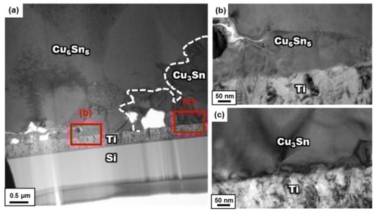 The adhesion layer, such as Cr and Ti, is the main component of the UBM used in the electronics industry. Owing to the rapidly consumed solder joints and wetting layer, the IMCs would attach to the adhesion layer with limited Cu during the solid–liquid reaction. This condition causes spalling, which is reported in numerous studies [,,,,,]. Spalling of the IMCs causes a significant reduction in bonding strength and affects the reliability of electronic products. In addition, the formation of IMCs in Cu–Sn reactions with limited Sn has been reported previously [,,,,,]. These studies only focused on the micro-structural evolution in the early stages of interfacial reactions, which were abundant with either Cu or Sn during the experiment. However, fewer studies have investigated the same when the constraint volume of Cu and Sn is simultaneously converted into the full IMC joints in the terminal solid-state reaction. In a previous study, Tsai et al. [] found that when the IMCs were attached to the Cr adhesion layer, Cu6Sn5 and Cu3Sn detached and left the substrate during the terminal solid-state reaction. In addition, this spalling process did not dominate the ripening or gravity effects of Cu6Sn5 compared to regular spalling. It was confirmed that the spalling was due to the high interfacial energy between the Cu and Sn intermetallic and Cr. Furthermore, void formation during the reaction was also observed, which was attributed to Cu diffusion. In contrast, the widespread usage of the Ti adhesion layer in the electronics industry is well-known, but no study has discussed the phenomenon when the IMCs contact the Ti adhesion layer during the solid-state reaction.