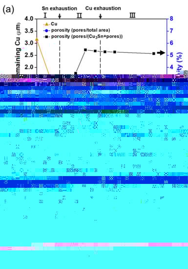 Figure 9 also shows the relationship between the remaining Cu thickness (orange line) and Cu3Sn growth thickness (red line) versus the two porosities mentioned in Equations (2) and (3). Figure 9a shows that the porosity increased rapidly when the remaining Cu thickness decreased steeply. This strongly indicated again that the void formation was caused by the Cu diffusion, which is referred to as Kirkendall voids. In Figure 9b, although the Cu3Sn growth thickness did not fully correspond to the trend of the porosity, it showed a similar change with the porosity curve.