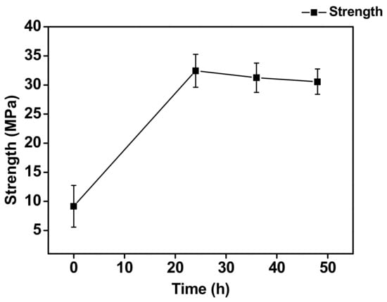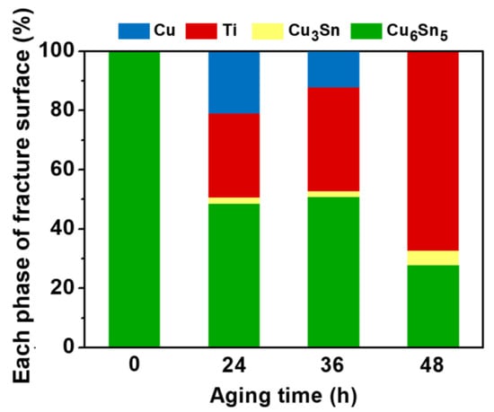 Figure 10b–d shows the fracture surface after aging for 24–48 h and Figure 11 shows the phase percentages of the fracture surface with different aging times. To ensure the full IMC structure in micro-bumps, the sample aging after 48 h was used in the die shear test. In the analysis of the fracture surface, four main layers, Cu6Sn5, Cu3Sn, Cu and Ti, were exposed at different aging times. The Cu3Sn layer was only slightly exposed in these SEM images. Interestingly, the exposed Ti layer increased with decreasing Cu6Sn5 layer thickness as the aging time increased.