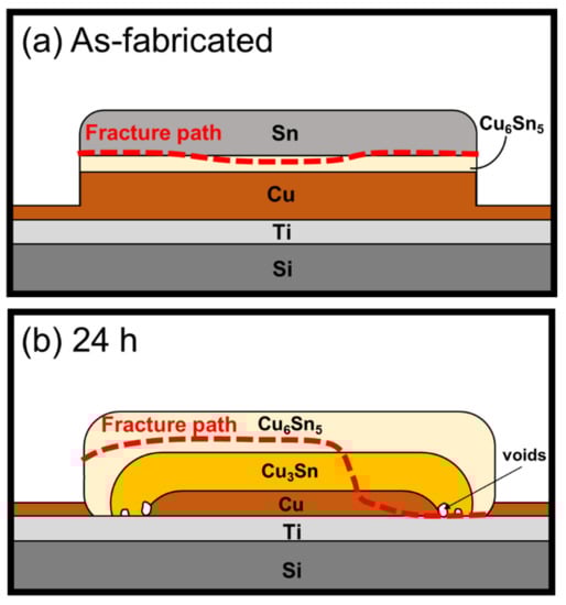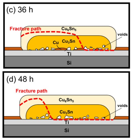 By combining the findings from the cross-sectional observation, fracture surface observation and strength measurement, a schematic summarizing the results of the fracture analysis is presented in Figure 13. After electroplating, a thin Cu6Sn5 layer was formed between the Cu and Sn layers; thus, the fracture occurred through the Sn/Cu6Sn5 interface with a very smooth fractured surface. When the aging time reached 24 h, the shear strength increased with the growth of Cu3Sn. In addition, according to the phenomenon mentioned above, the outer edge of the micro-bump formed some voids at the Cu3Sn/Ti interface. The stress concentration would be developed around these voids, which could more easily cause the crack growth. Therefore, the crack propagated along with the Cu6Sn5 layer and extended to the Cu3Sn/Ti interface. Furthermore, when the aging time increased to 36 and 48 h, the Cu3Sn layer grew increasingly with the depletion of the Cu layer, and the void formations also increased at the Cu3Sn/Ti interface. Thus, the cracks propagated more easily and extended to the Cu3Sn/Ti interface. This led to an increase in the percentage of the exposed Ti area on the fracture surface with increasing aging time. However, since the fracture surface mainly occurred at the Cu3Sn/Ti interface, the adhesion between Cu3Sn and Ti was the main factor controlling the shear strength. Therefore, the strength did not change with increasing aging time and the number of micro-voids. The micro-structural characterization suggested that the key reason for determination of the micro-bump strength was not the void formation but the types of the IMC interface. Therefore, it is important to realize the interfacial reaction and IMC formation during the miniaturization of micro-bumps to achieve better joint strength.