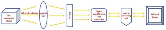 In this study we used an M300 RTK UAV from DJI (Shenzhen, China), which was paired with a Zenmuse H20T infrared thermal imaging camera, as shown in Figure 1. Using the M300 RTK’s flight control system, the UAV could view the temperature distribution of the photographic interface on any trajectory and at any angle to obtain the required infrared images. Then, the infrared image data processing software was used to visualize the temperature distribution of the measured area. The principle of operation of infrared thermography involves the use of infrared detection elements. Thus, the infrared radiation emitted by the object was received during the test, the power signal radiated by the object was converted into an electrical signal and amplified, and then, after digital processing and image processing, a thermal image with better temperature values was finally presented on a display device [16], as shown in Figure 2.