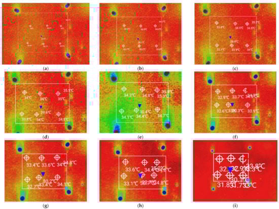 Infrared images at different measurement heights: (a) h = 3 m, (b) h = 4 m, (c) h = 5 m, (d) h = 6 m, (e) h = 7 m, (f) h = 8 m, (g) h = 9 m, (h) h = 10 m, and (i) h = 11 m.