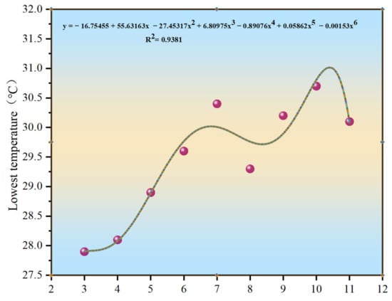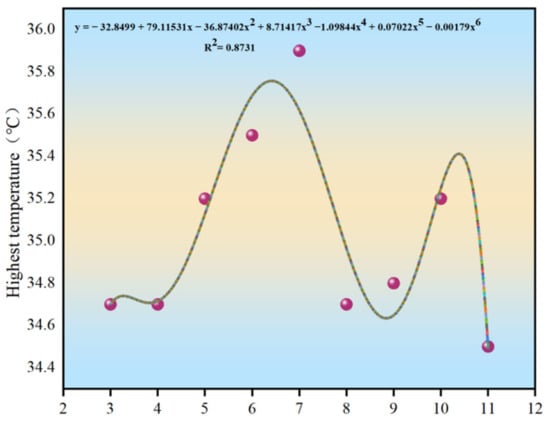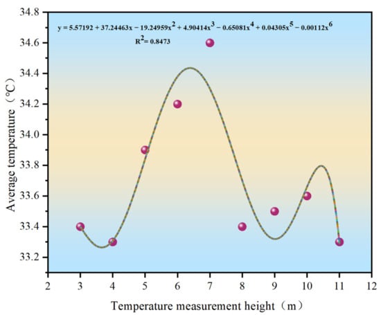 As shown in Figure 5, Figure 6 and Figure 7, the distribution curves of the maximum and average temperatures followed the same pattern of low change. Although fluctuations in temperature occurred between the different heights, the variations in temperature between the adjacent heights were minor and did not exceed 1 °C. The maximum temperature fluctuated around 35 °C, whereas the average temperature was around 34 °C. The variations in the minimum temperature curve were different; however, the temperature fluctuated around 30 °C. With increasing measurement height, the measurement area increased and was more subject to various uncertainties. The combined temperature data showed that the measured temperature values were all single-point, and the maximum and minimum temperatures were not the same between the different heights in the same area. Hence, the average temperature was more representative. When the measurement height was between 7 and 8 m, the three curves were close to each other, and the variations in each temperature were the smallest. Combined with the measurement results of the point-type temperature-measuring gun, the best temperature measurement height was determined to be 7–8 m.