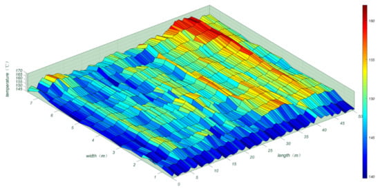 As shown in Figure 10, the temperature distribution of the SMA-13 asphalt mix pavement after paving was very uneven, with a large temperature span. The Chinese standard JTG F40-2004 [22] specifies that the paving temperature has to be greater than or equal to 160 °C, and the temperature at the start of the initial grind must be greater than 150 °C. In the research area, the maximum temperature was 168 °C, and the average temperature was 155 °C, with the lowest temperatures (142 °C) located in the marginal parts. Therefore, we inferred that the proximity of this area to the shoulder resulted in edge temperatures that did not meet the specification requirements [22], and temperature segregation could occur, affecting the road performance.