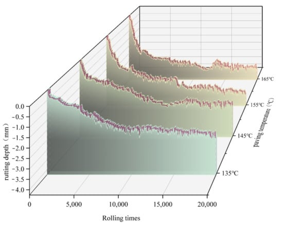 As shown in Figure 11, the rutting depths at 10,000 and 20,000 wheel rolls met the requirements of the Chinese specifications of ≤4 mm and ≤10 mm [17], and the paving temperatures of 135 °C, 145 °C, 155 °C, and 165 °C at a wheeling depth of 20,000 were 3.576, 3.472, 2.639, and 2.401 mm, respectively. The rutting depth at a paving temperature of 135 °C increased by 48.9% compared to that at 165 °C. The rutting depth at the 145 °C positions increased by 35.5% compared to that at the 165 °C positions, whereas the rutting depth at the 155 °C positions increased by only 3.0% compared to that at the 165 °C positions. This indicated that when the paving temperature of the asphalt pavement was below 155 °C, temperature segregation may have occurred, and its resistance to rutting was significantly reduced after grinding, affecting the performance of the road.
