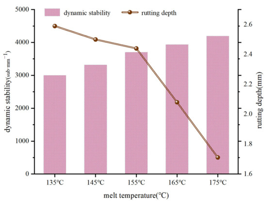 The dynamic stability of the asphalt mixture specimens at different melt temperatures in the wheel tracking test satisfied the requirements of JTG E20-2011 (T0719), as shown in Figure 13 [17]. The rutting depth decreased as the melt temperature of the specimen increased, with the rutting depth decreasing by 0.15 mm as the melt temperature increased from 135 °C to 155 °C. The rutting depth was reduced by 0.73 mm when the melt temperature increased from 155 °C to 175 °C, and as the melt temperature gradually increased, the dynamic stability showed a steady increase, reaching 4221 cycles/mm when the melt temperature was 175 °C.