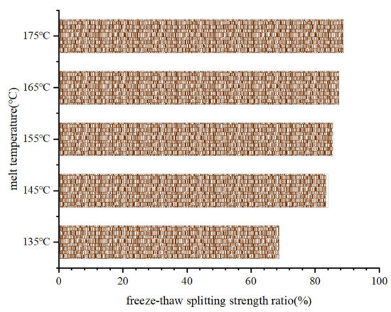 As shown in Figure 14, when the melt temperature was 135 °C, the freeze-thaw splitting strength ratio was 68.8%, which did not meet the specification requirements. However, when the melt temperature was above 145 °C, the freeze-thaw splitting strength ratios of all five groups of specimens met the specification requirements. With an increase in the melt temperature, the freeze-thaw splitting strength ratio of the asphalt mix increased slightly; however, the increase was minimal. When the melt temperature was 175 °C, the freeze-thaw splitting strength ratio of the asphalt mix had a maximum value of 88.9%. This showed that the effect of melt temperature on the freeze-thaw splitting strength ratio was small, and the asphalt mixture specimens at different melt temperatures can maintain good water stability under freeze-thaw cycles, making the pavement less susceptible to water damage. This was because the melt temperature was more significant than 145 °C, the aggregate was covered by the asphalt, and the adhesion strength of the asphalt to the aggregate was greater, which improved the water stability of the asphalt mix.