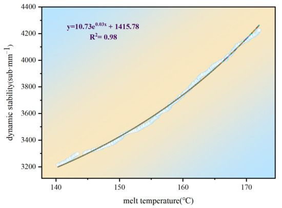 As shown in Figure 15, the predictive model for melting temperature/dynamic stability followed y = 10.73e0.03x + 1415.78, R2 = 0.98; therefore, in the process of asphalt pavement construction, the melt temperature could be used to further predict the dynamic stability distribution of the asphalt pavement through temperature acquisition by means of UAV thermal imaging technology. This would make it possible to quickly determine whether the high-temperature stability of asphalt pavements would meet the specification requirements during construction, significantly improving the efficiency of testing the quality of asphalt pavement construction.