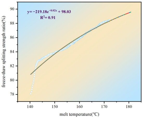 As shown in Figure 16, the predictive model for the resulting melting temperature/freeze-thaw splitting strength ratio was y = −219.18e−0.02x + 98.03. During construction, the freeze-thaw splitting strength ratio of the asphalt mixture could be quickly predicted based on the paving temperature to evaluate whether the water stability of the asphalt pavement could meet the requirements of the standard JTG E20-2011 (T0719) [17]. For locations that would not satisfy the requirements, adjustments could be made when appropriate.